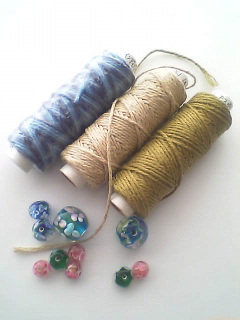 ヘンプ と トンボ玉を 組み合わせて 編み込んで作った