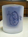 4 細かい砂の粒をコップに吹きかけ、全体をスリガラス状にします